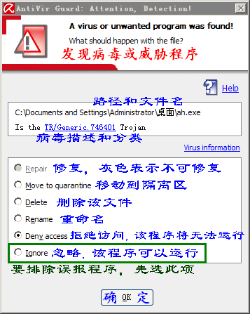 小红伞软件(AntiVir)可能会误报一些程序(例如破网软件)为病毒或危险程序。在确认软件的来源没有问题的情况下,就可以认为是误报导致的,那么就在警报的对话框里面选择ignore忽略,之后在软件里面排除误报文件。