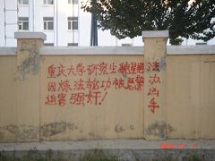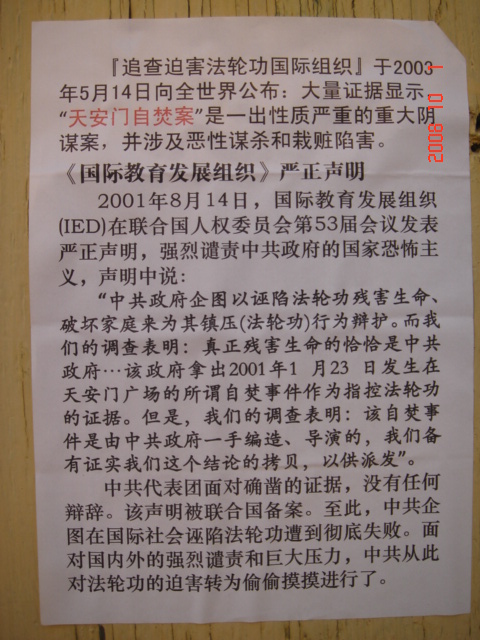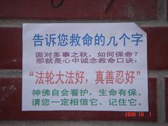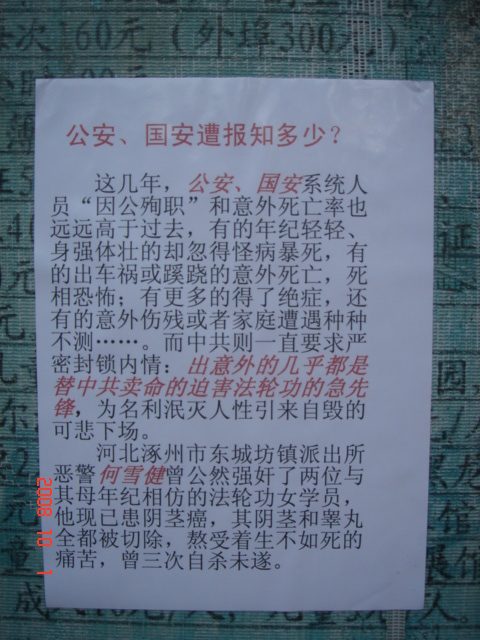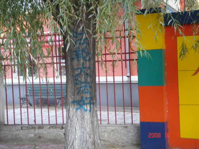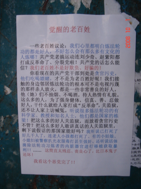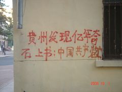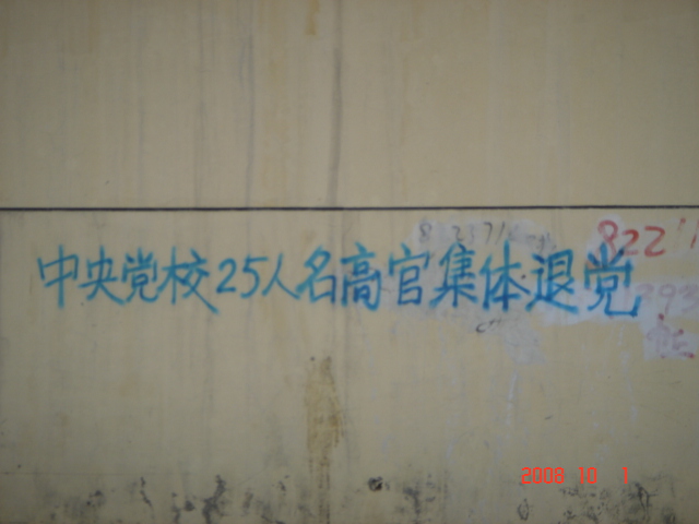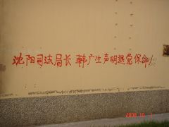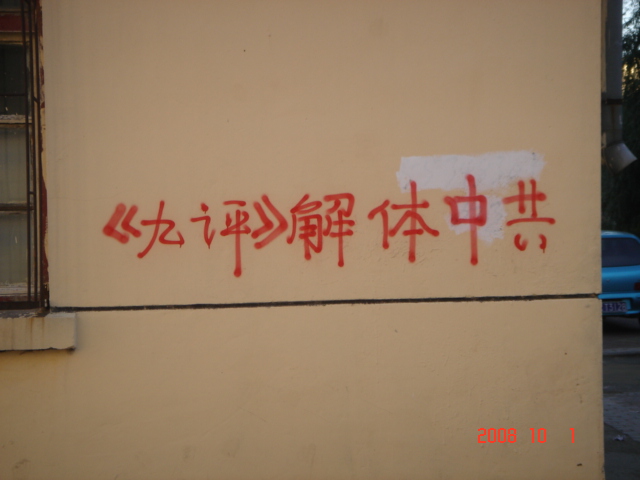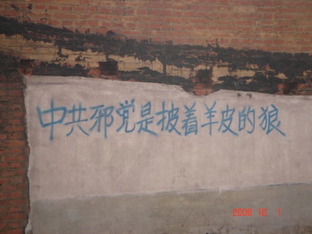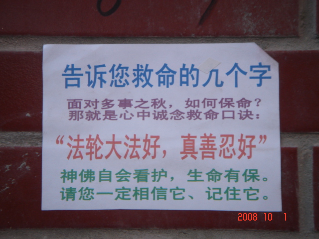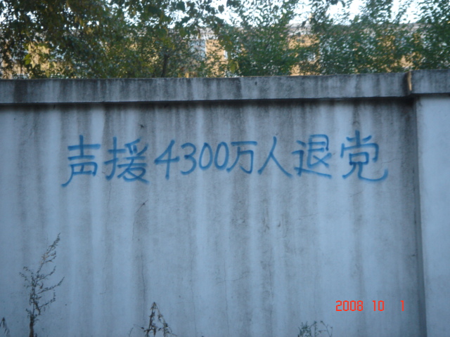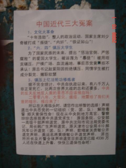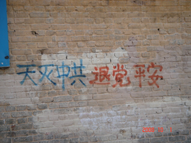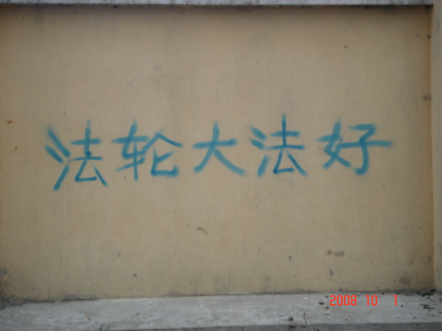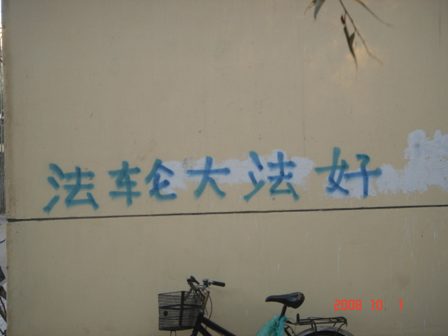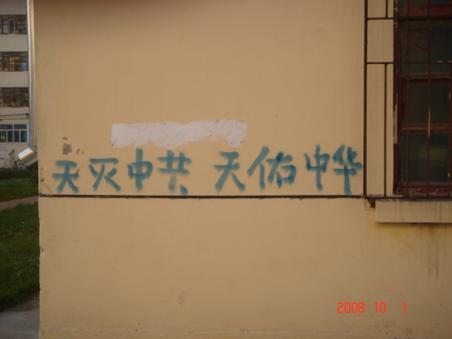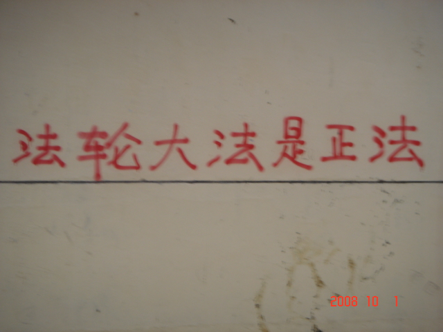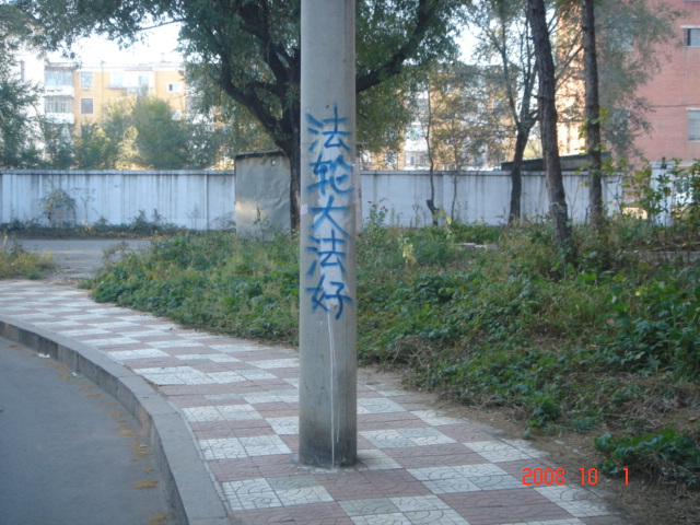 在十月一日,中国大陆北方某城市出现了天灭中共以及为法轮功呐喊平反、法办江泽民的大量真相标语,在道路两边的电线杆上、围墙上、家属楼的墙上、大树上等出现喷漆和不干胶标语.喷漆喷出的标语有:“天灭中共”、“退党保命”、“声援四千三百万人退党”、“沈阳司法局长韩广生声明退党保命!”、“中央党校25名高官集体退党”、“贵州发现亿年奇石上书:中国共产党亡”、“法轮大法好”、“重庆大学研究生魏星艳因炼法轮功遭恶警强奸的迫害!法办凶手”、“信仰无罪,停止迫害”、“平反法轮功,法办江泽民”、“法轮功被迫害千古奇冤”等;不干胶上写着:“追查迫害法轮功的国际组织”公布天安门自焚案是一出重大的阴谋栽赃陷害!、“中国大陆公安国安迫害法轮功恶报知多少?”、“中国三大冤案:文革、六四、迫害法轮功”、“老百姓觉醒了”及退党声明等。