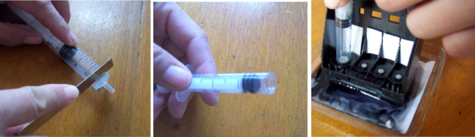 ![]() 图:将针管的顶端切掉,针管的粗细恰好能套在打印头的吸墨嘴上 |