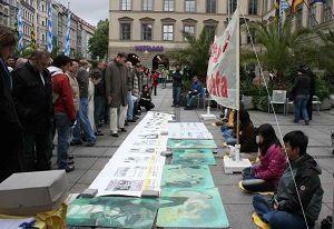 二零零八年十月四日,德国巴伐利亚州的法轮功学员在慕尼黑市中心圣•米歇尔教堂前举办活动,向民众展示法轮大法的美好,揭露中共对法轮功的残酷迫害。
