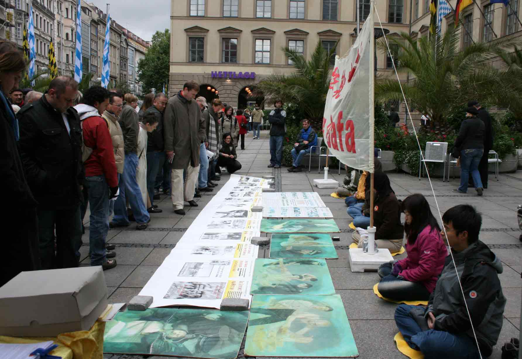 当日,一年一度全球最大的民间节——慕尼黑啤酒节已经接近尾声,内城里每天依然熙熙攘攘的挤满了来自世界各地参加啤酒节的游客。虽然天气不好,时有阵雨,依然挡不住法轮功学员向全社会揭露中共的邪恶本质。他们向路人分发有关退出中共大潮、欧卫在中共的威逼利诱下中断新唐人的播放、法轮功真相资料和揭露中共活体摘取法轮功学员器官等资料。法轮功学员在一旁安静祥和地炼功,吸引了大量路人驻足观看。不少人仔细的阅读有关资料、展板和图说,也有不少人向法轮功学员询问,为什么中共要迫害法轮功、法轮功到底是怎么回事儿。