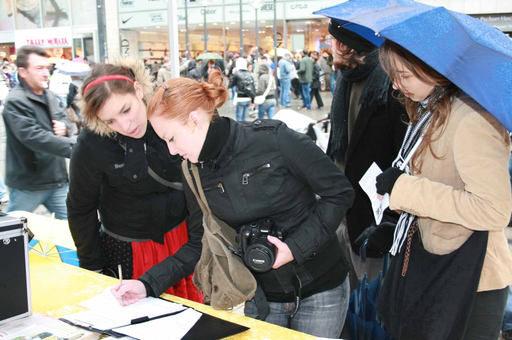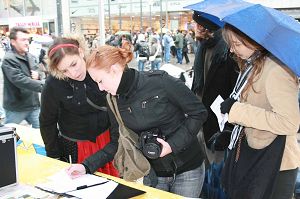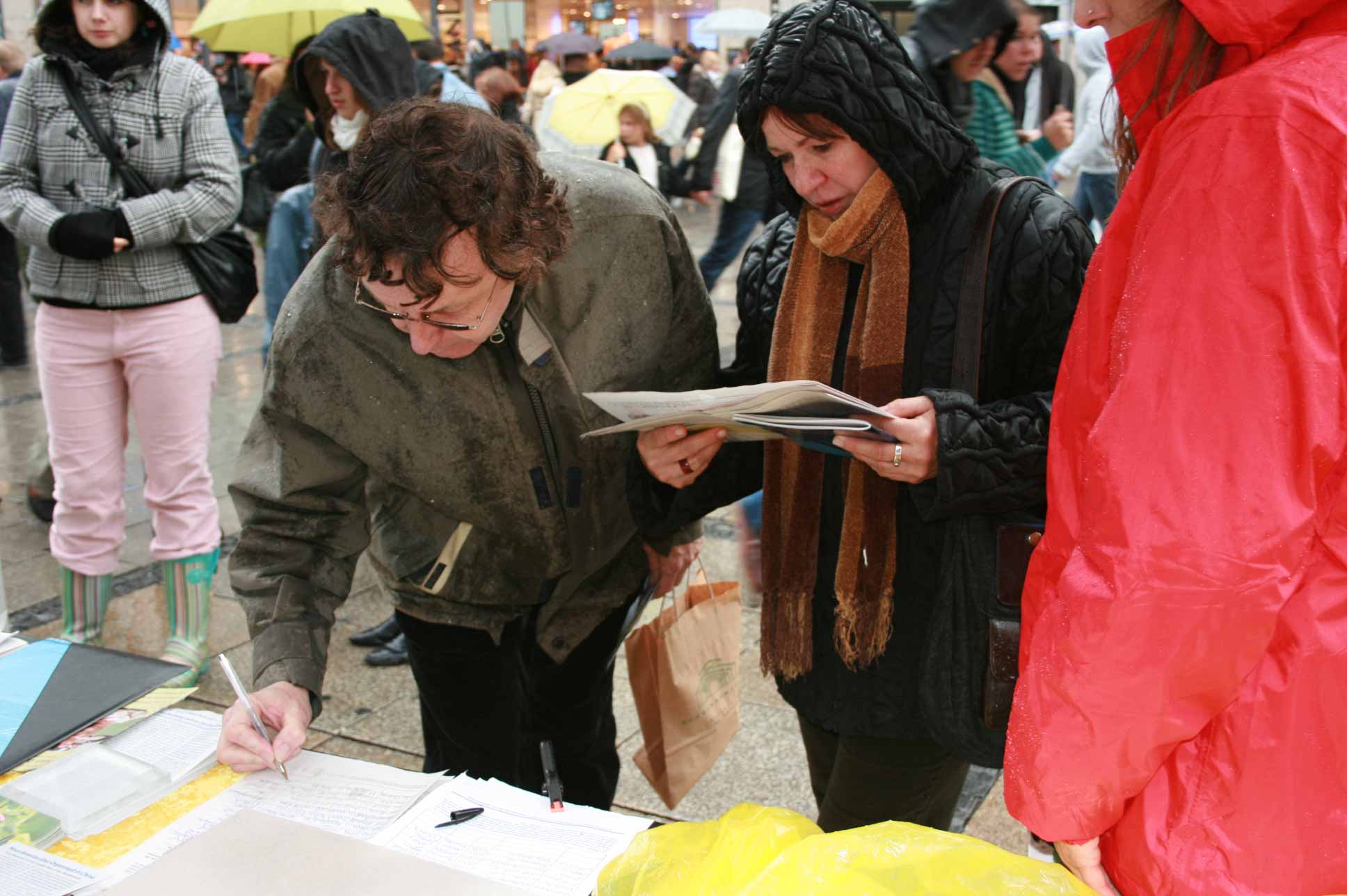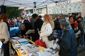 过往的中国人很多,他们中年纪大一些的人比较容易接受真相材料,但是一些很年轻的,由于他们从小就被中共的谎言毒害,因此比较难接受真相,但他们又很渴望了解真相,有些人站在远处观望、有些人不停的拍照。一位年轻的女孩对法轮功学员说,她的父母都来自中国大陆,她从小在德国生活,经常看报纸上刊登法轮功学员受中共迫害的事。她签名声援法轮功之后,最想了解的是法轮功到底是什么,为什么中共要迫害他们。学员告诉她,因为法轮功学员是以“真、善、忍”为准则来要求自己,这和中共的“假、恶、暴”就形成了鲜明的对比,而且修炼法轮功的人数增长很快因此中共对法轮功无法忍受,非要迫害法轮功。但持续九年的迫害,中共并没有达到目的,反而现在落得面临解体的下场。还有一个年轻的姑娘从远远站在一旁的几个中国伙伴身边走过来,主动索要法轮功的真相材料,并告诉学员她已经在网上做了退团声明了,她说:“我非常爱看这些材料,你们做的太好了。”
