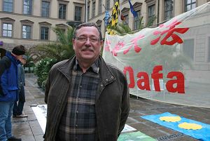 房地产经理帕胡勒克先生(Christian Parchulek)带着邻家两个半大男孩到慕尼黑参加啤酒节,当他们路过圣•米歇尔教堂时,被法轮功学员炼功的动作吸引,一直站在那里观看。当被问到是否要签名谴责中共时,他爽快的答应。签完名之后他告诉记者,他们是从原东德地区莱比锡来的,他在共产党的统治下过了四十年,很清楚共产党是怎么回事儿,因此对中共所犯下的滔天大罪他认为完全能够想象,共产党干得出来任何事情。他指了指身边的两个男孩说,象他们这么大的年龄就不清楚共产党的邪恶了。他说:“我在电视里看到北京奥运会,感到了那种共产强权的味道。”他强调说他一点都不喜欢那种感觉。
