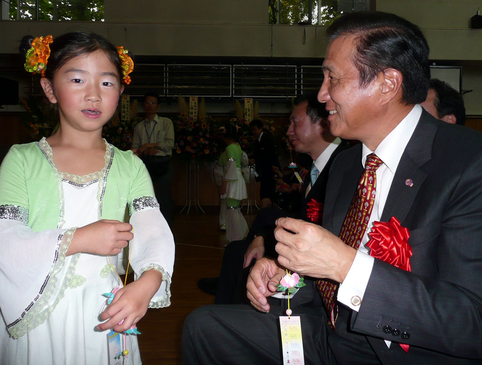 法轮功小弟子向观众赠送了自己精心制作的纸莲花。莲花上悬挂着洪扬法轮大法的精美书签。中华民国新任驻日代表冯寄台先生高兴的接受了小弟子的莲花。