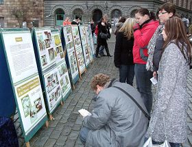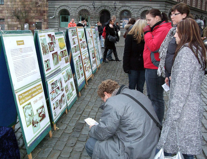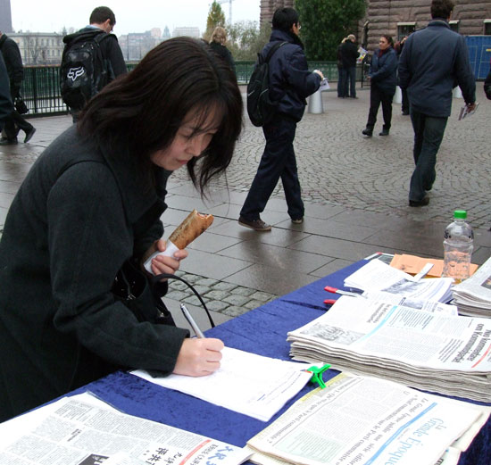 不大一会,他又转了回来问法轮功学员张女士在哪里能买到法轮功的书籍。原来这是一位刚刚从中国大陆来到瑞典乌普萨拉一所大学里上学的留学生。他对张女士说:“我就是想要看看有关法轮功的书籍,但是在国内一直也没找到。”张女士将法轮大法网站的网址、以及自己的联系电话都给了这位年轻人,并告诉他如果今后需要帮助,随时可以联系她。这位年轻人很高兴。