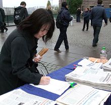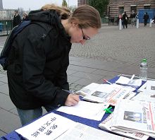 一位居住在瑞典的日本女士她叫藤旧篥子(Reiko),她对学员说,她已经知道了在中国发生的这些可怕的事情,她决定要捐一些钱表示对这个活动的支持;学员婉言谢绝了她。她在签名簿上工工正正签下了自己瑞典和日本的名字。
