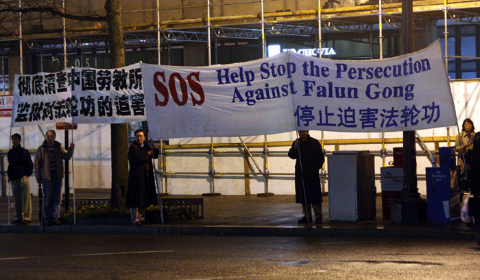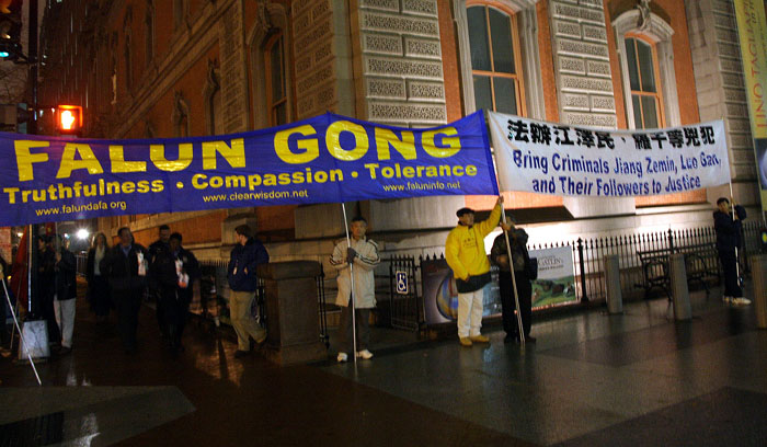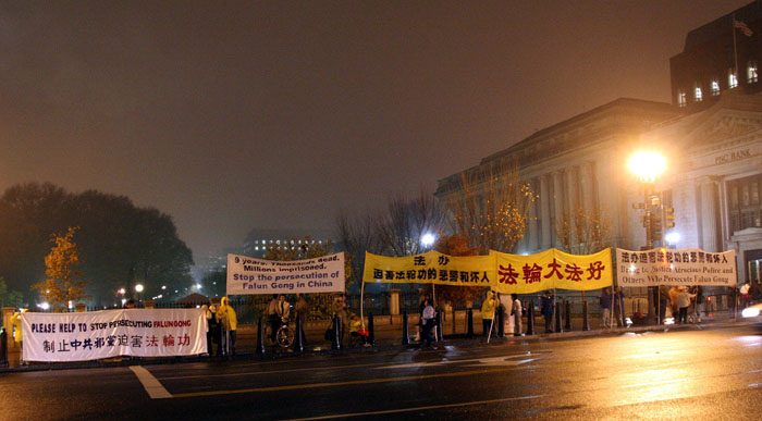 华盛顿DC这两天是少见的阴雨连绵。十三日傍晚,世界各国领导人的车队在雨中陆续抵达白宫出席晚宴。在通往白宫的几条主要街道的两侧,当地法轮功学员打起横幅,格外醒目。