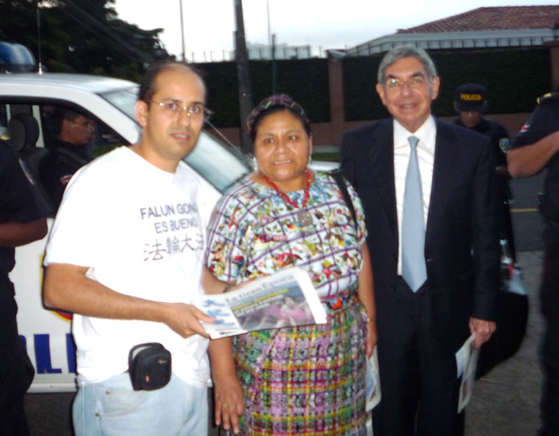 不久,哥斯达黎加总统阿里亚斯与曾获得诺贝尔和平奖的危地马拉女政治家里戈韦塔·门楚·图姆(Rigoberta Menchu Tum)从中使馆对面的总统府出来,来到了法轮功学员的面前。学员向他们讲解了在中国还在发生着对法轮功修炼者的残酷迫害,希望他们能帮助一起制止这场非人道的残害。