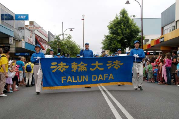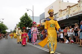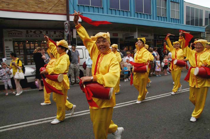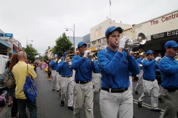 法轮功学员的游行队伍以悉尼天国乐团为前阵,接下来是中国民间故事的装饰表演、唐装表演、中国民族服装表演,最后以腰鼓队压阵。法轮功学员游行队伍的出现把整个游行推向了高潮。两旁的观众不由自主的走进游行队伍,想看个真切。