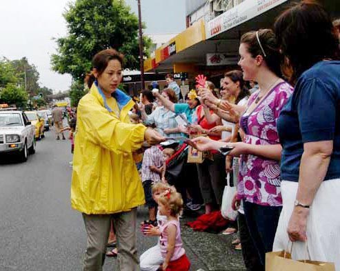 在此的观众大多数都是第一次接触到法轮功,他们真心想知道什么是法轮功。来自悉尼的法轮功学员何阿姨高兴的说,这里的人很纯朴,非常愿意接受真相资料,在游行结束时,每人都拿到资料了。大法的福音来到了戈斯福德市。