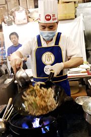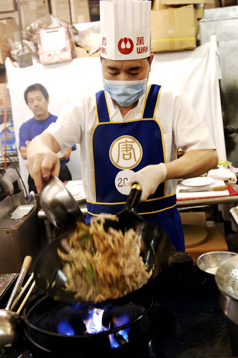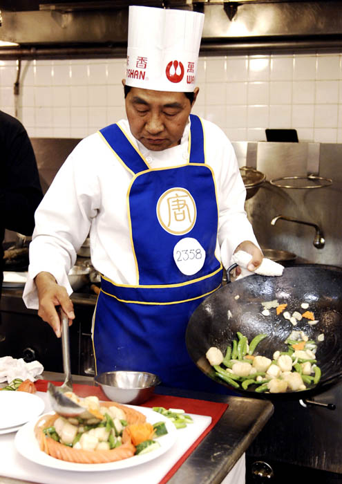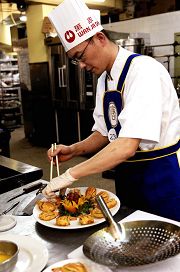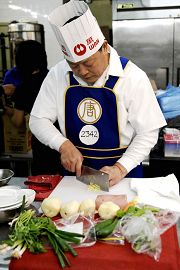 ![]() 中国菜的特色是“色、香、味、形”,还讲究刀功和火候;选手们正在用心做菜。 |
