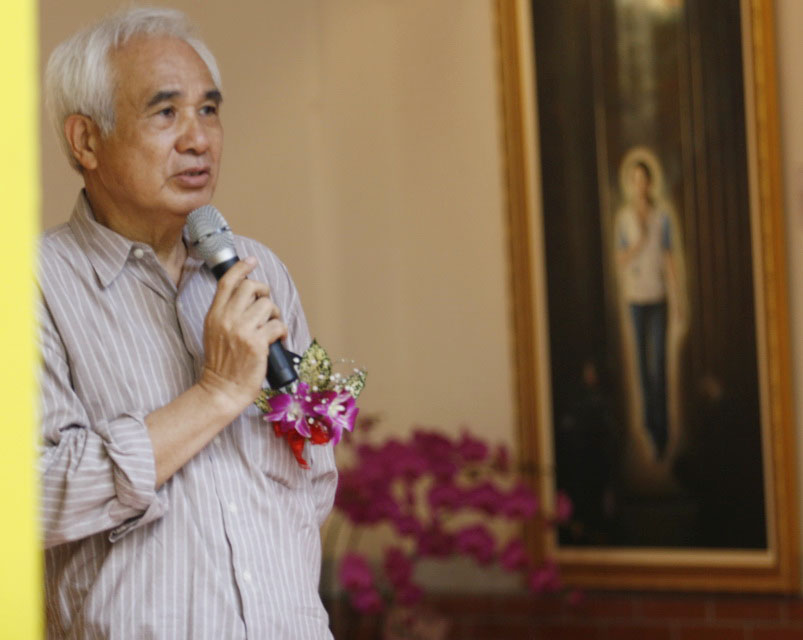 ![]() 前国立台湾师范大学艺术学院院长张清郎教授(戴帽者)前来观画 |