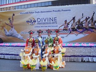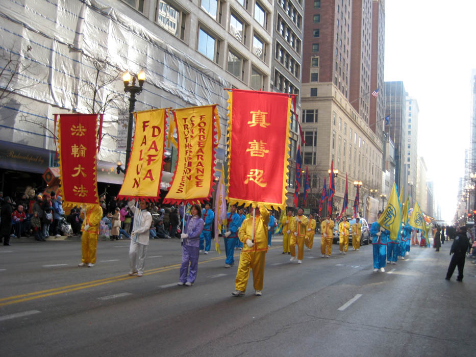 ![]() 美中法轮大法学会在二零零八年十一月二十七芝加哥感恩节游行中的“大唐”旗队 |