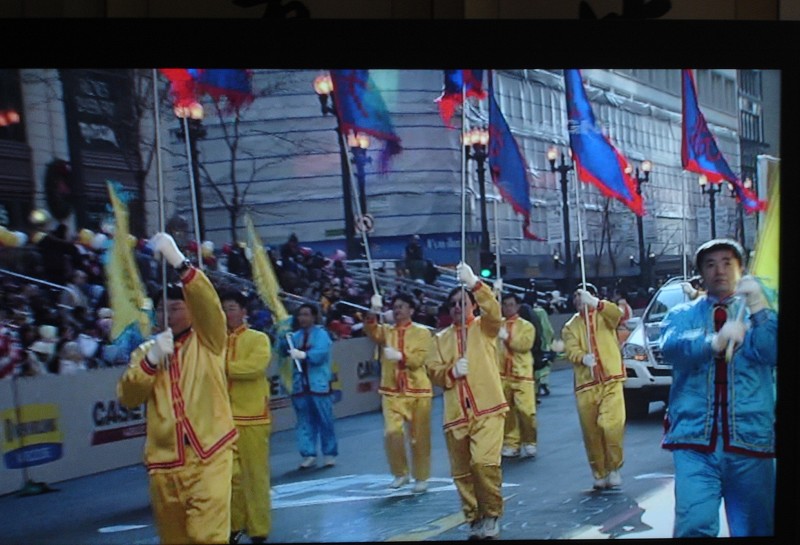 ![]() 美中法轮大法学会在二零零八年十一月二十七芝加哥感恩节游行中的“大唐”旗队(WGN电视台直播画面) |