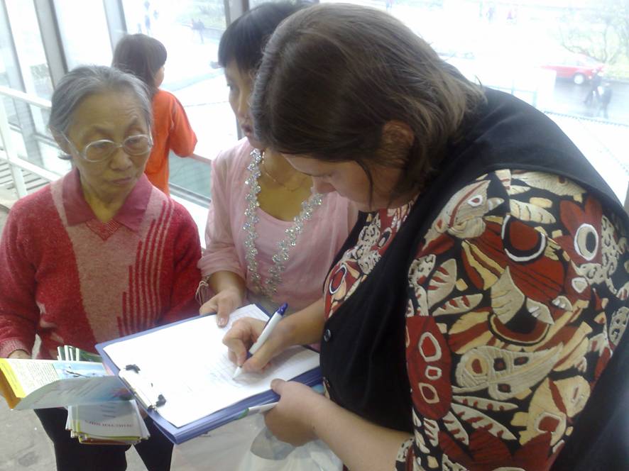 ![]() 人们来到法轮功展位前详细了解真相 |