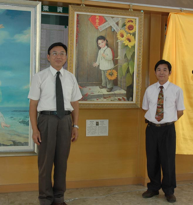 ![]() 校长郑越庭(左)、黎明国小校长胡坤璸(右)为画作“无家可归”揭幕。 |