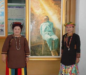 ![]() 原映排湾族文化寻根协会理事长卡莱凯(左)、答给发力美食坊吴阿美(右)为画作“坚忍不屈”揭幕。 |