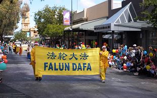这一天,碧空如洗,阳光明媚。来自印度、朝鲜、日本等不同种族、不同文化背景的八十三个团体参加了本次游行。风格各异的民族节日服装,传统而欢快的乐曲,为“节日之都”阿德雷德尽情渲染着圣诞色彩。南澳法轮大法学员组成的方队是游行队伍中一个宁静的亮点。祥和的音乐中,绽放的莲花,端庄贵气、色彩艳丽的唐代服饰表演和身着飞天服装的学员功法展示,受到了在场观众的喜爱。当一位市民看到学员手中的横幅“世界需要真、善、忍”时,向学员们频频点头说:“是的,是这样的!你们非常出色!”