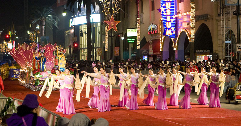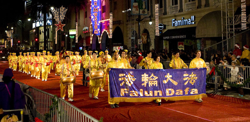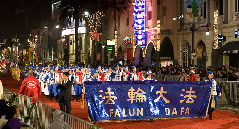 ![]() 在好莱坞圣诞游行中,盛大的法轮功队伍引人注目。 |