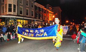 二零零八年十二月五日星期五晚,法轮功华盛顿DC腰鼓队和特拉华部份法轮功学员应邀参加了美国宾州西切思特一年一度的圣诞游行,为当地民众带来惊喜,受到热烈欢迎。