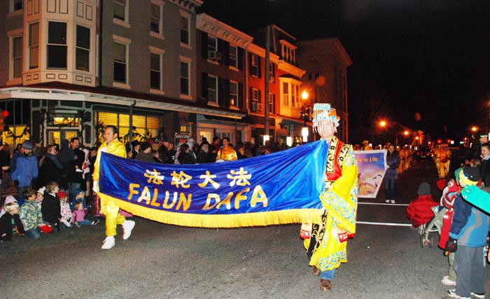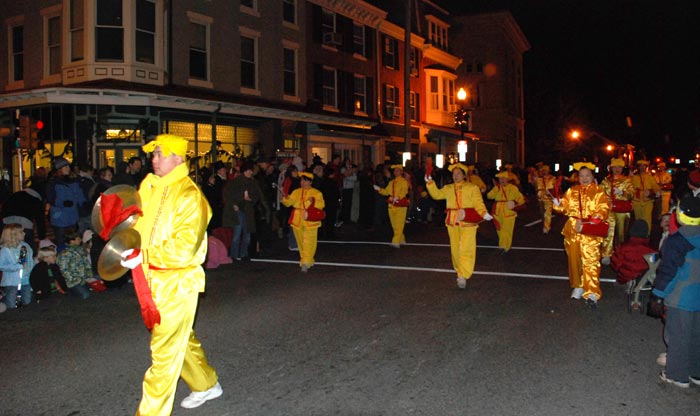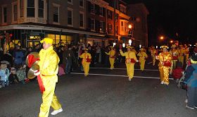 十二月五日游行当晚,天气非常寒冷,西切思特民众的热情丝毫未受到影响,大人、孩子早早就将游行沿途的街道两边挤的满满的。应邀前来参加游行的法轮功腰鼓队是唯一的亚裔队伍,当腰鼓队队员欢快的鼓声伴着“法轮大法好”的乐曲通过时,人群发出阵阵欢呼声和鼓掌声。法轮功学员给人们带来了大法的福音和费城神韵晚会的信息。一些民众是第一次看到神韵晚会的信息,看着晚会的资料,他们惊叹的表示:好漂亮,一定不会错过这个演出。还有一些人高兴的说,已经知道神韵晚会的信息了。