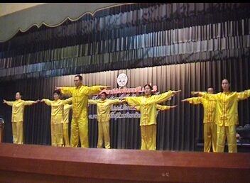 法轮功学员还应会方邀请,在主会场大厅举办法轮功专题讲座。在学员的讲解示范下,全体观众伴随优美的炼功音乐现场学炼五套功法,把会场气氛推至高潮。