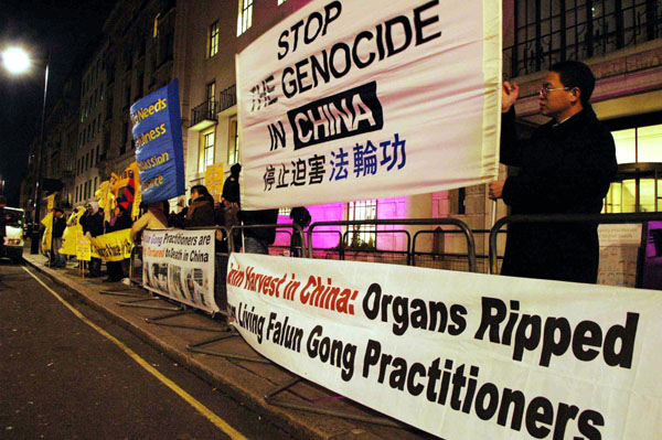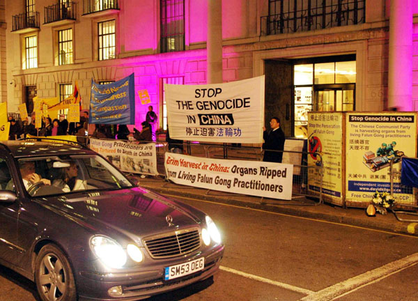 在伦敦参加抗议活动的法轮功学员冒着寒风在夜幕下站了两个多小时。他们打出的中英文横幅在路灯下非常醒目,也非常惊心,吸引了过往行人的注意力。横幅上面赫然写着:“法轮功学员在中国被迫害致死”、“在中国正从活着的法轮功学员身上摘取器官”、“停止迫害法轮功”等等。活动期间一直有学员在发放真相传单。
