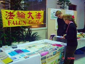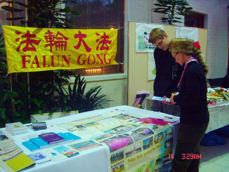 法轮功学员小金与先生租了摊位,摆放了展示法轮大法在世界上八十多个国家洪传的图片,及芬兰文的《转法轮》和一些大法资料;同时还展示了揭露中共酷刑折磨法轮功学员的图片。