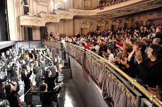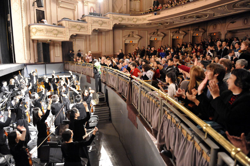 ![]() 演出结束时,观众起立鼓掌,向演员致谢。 |