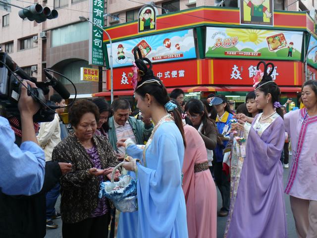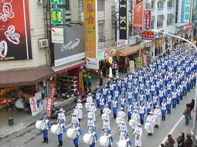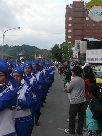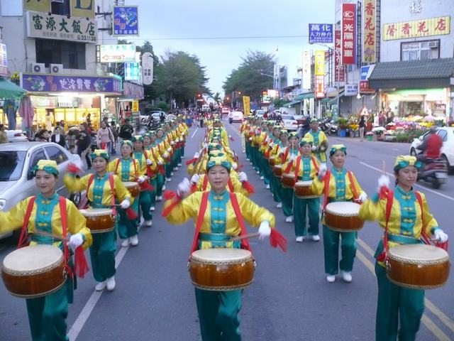 天国乐团一百五十位团员穿着蓝白相间的中华传统古装登场,把法轮大法的祥和与美好,传送给道路两旁热情观赏的民众。队伍后面是由九位仙女组成的仙女队,穿着富丽典雅唐装的仙女们,沿路分送一朵朵系着「法轮大法好」书签的莲花,民众争相索取,露出开心的笑容。五十位由屏东和台东法轮功学员组成的「天威唐鼓队」,精神抖擞的演出,赢得沿途民众热烈掌声。