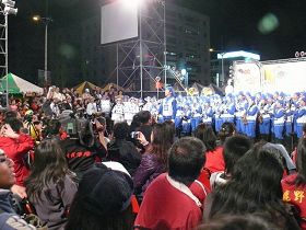 晚间各踩街队伍轮番上台进行定点表演,天国乐团在群众安可声中,共演奏《法轮大法好》、《法鼓法号震十方》、《法正乾坤》、《送宝》、《佛恩圣乐》等五首乐曲,民众轻轻打着拍子,专注的听着祥和的乐音,每首曲子结束,便爆出如雷的掌声。