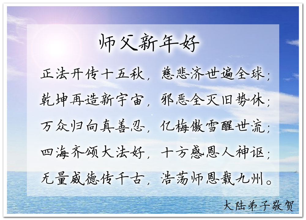 新年即将来临了,我们向伟大的师尊拜年:师尊新年好!您把这方的众生交给我们救度,我们一定会努力做好,不辜负师尊的重托,请师尊放心。我们听师尊的话,修好自己,共同配合做好三件事,走好最后的路。
