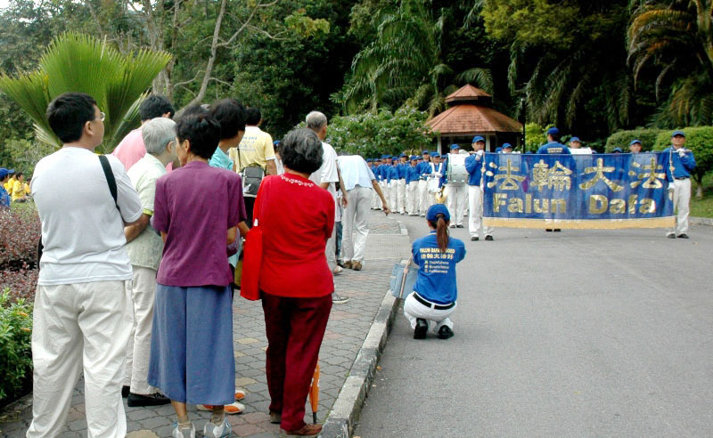最后,由马来西亚与新加坡法轮功学员组成的天国乐团接近傍晚六时开始演奏。这次有约百人组成的团队,带来多首震撼人心的乐曲,其中包括《法轮大法好》、《法鼓法号震十方》、《法正乾坤》、《佛恩圣乐》、《送宝》等,把整个活动带入另一个高潮。
