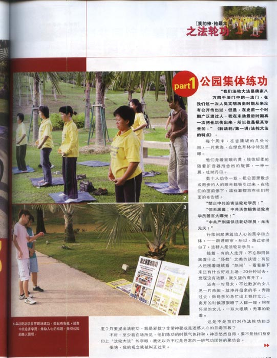 报导也专访法轮功学员杨生夫妇如何开始修炼法轮功。杨先生说他们是在书局看见法轮功的影音光碟而走入法轮功。而杨太太则说,她一直修炼到一九九九年中共开始迫害法轮功,当时脑中一片空白,心里有说不出的难受。「我们在户外炼功,常常被人丢石头和咒骂,时间一久,他们也明白我们并非是什么×教,就不来干扰我们。」