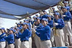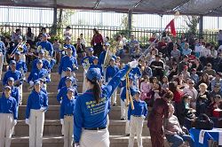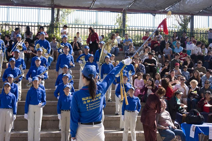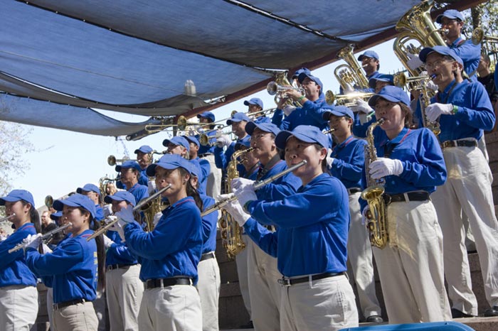 上午,各族裔的大游行为整个活动拉开序幕。法轮功学员整齐的装束、精神振奋的神采,感染着每一个人;清亮的音乐在空中传来,人们的目光都在追逐着这支身着蓝衣、白裤、蓝帽的军乐团,在惊叹于乐团大部份成员是华裔的同时,人们对他们的演奏报以热烈的掌声。