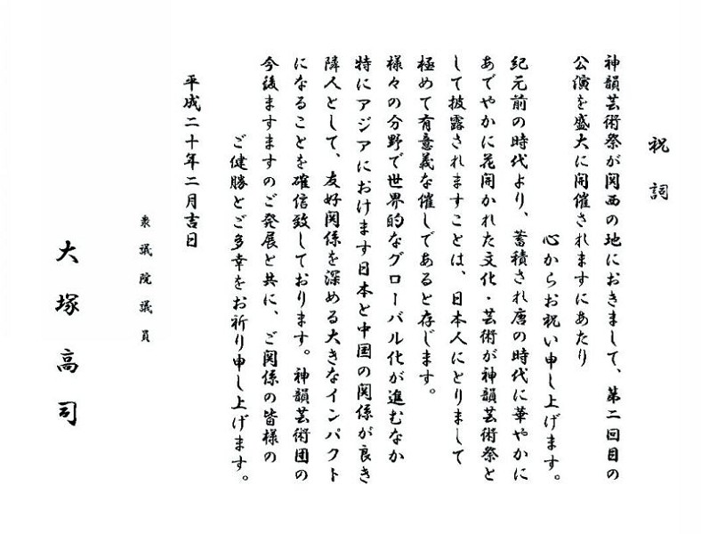 听闻近年来名扬天下并得到了长足发展的「神韵晚会」将登上NHK大阪音乐厅的舞台,对此我表示诚挚的祝贺。