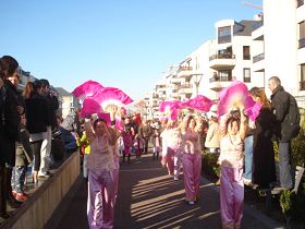 和往年一样,法轮功学员也参加了这次的新年游行。色彩亮丽的法轮功队伍令人瞩目。一队是粉红色的扇子舞,另一队是金黄色的腰鼓队,呈现出喜庆、吉祥的气氛。游行队伍经过了市民住宅区,观看的人潮不断。扇子舞吸引了六、七个法国小女孩儿,她们跟随在扇子舞队后,一边走一边模仿着比划着跳,十分天真可爱。