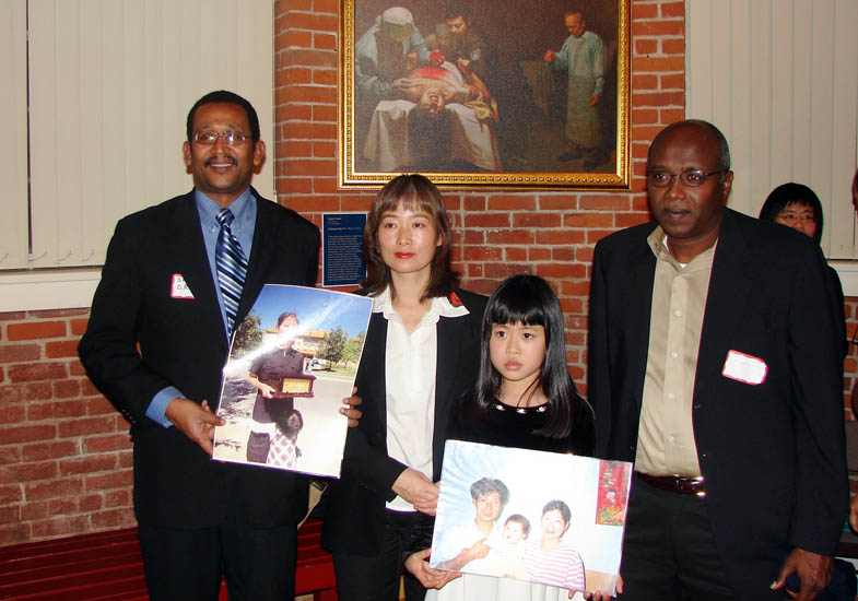 前来观看画展和参加「人权圣火传递」介绍会的「拯救达尔富项目」(The Darfur Rehabilitation Project)负责人塔哈(Sabri M. Taha)在听完戴志珍丈夫被迫害致死的经历后,主动希望同戴志珍和小法度合影,表示对她们的支持,并说要在他们组织的刊物上发表戴志珍一家的受迫害经历,让更多的人了解正在中国发生的残酷迫害。