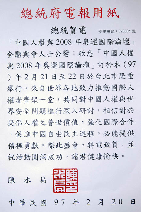 ![]() 台湾总统陈水篇致电贺词,祝活动圆满成功 |