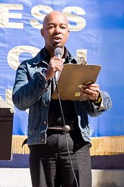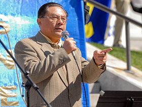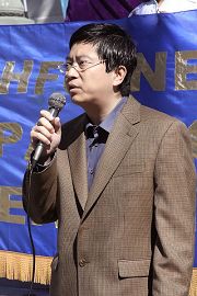 ![]() 法轮功学员、UCLA教授吴英年在集会上揭露中共恶党对法轮功犯下的滔滔罪行。 |