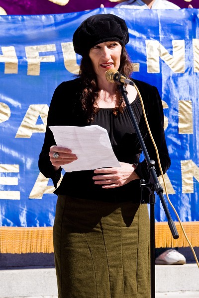 ![]() 关心中国人权的自由作家Theresa Moreau在集会上谴责搞无神论的中共残酷压制民众的信仰。在发言结束时她说:“希望毛和中共在地狱里腐烂。”(Rotten in the hell.) |