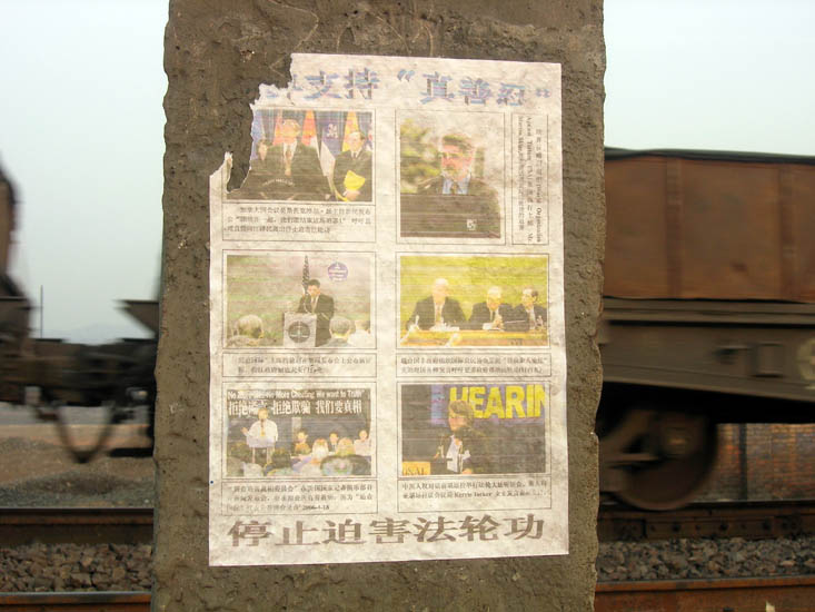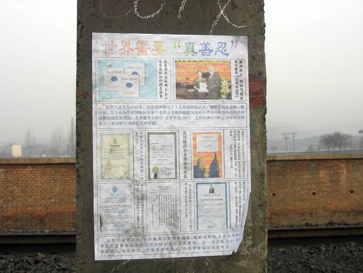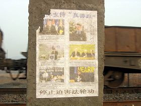 在河北某地的铁道水泥杆上,贴着“停止迫害法轮功”和“世界需要真善忍”的讲真相的宣传画,引得路人争先观看。