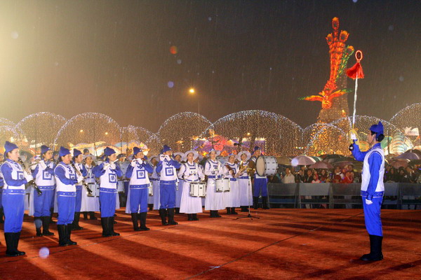 台湾灯会期间,每晚均安排舞台节目演出。周末的天空虽然间歇的飘着雨,民众仍不断聚集围绕主舞台周边等待表演,首先由新唐人旗鼓队揭开序幕,接着主持人介绍近三百名来自全省各地、多阶层的男女老少组成的天国乐团出场,身着中国古代深浅两款古装、手持西洋鼓乐器的团员,一亮相即吸引了民众的目光。