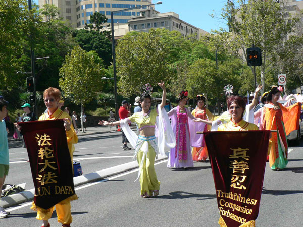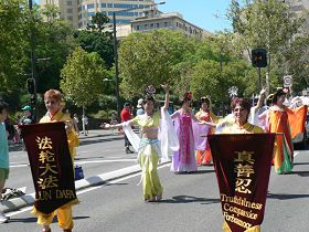 游行在上午十点开始,法轮功队伍是压轴队伍,当法轮功队伍通过主席台时,有几位激动的站立起来鼓掌。