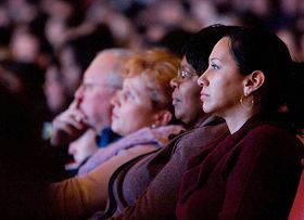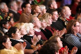 二零零八年新唐人全球华人新年晚会在纽约无线电城的周六晚场演出中,精彩纷呈、高潮迭起,现场观众为之倾倒、陶醉,坐在记者前排的白人约翰一家四口随晚会的节目情节而乐而忧。