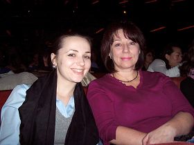 Olga Bashkapoba和姐姐Virginia Bashkapoba一同观看晚会,中场休息时,她们你一言我一语争着谈感受。