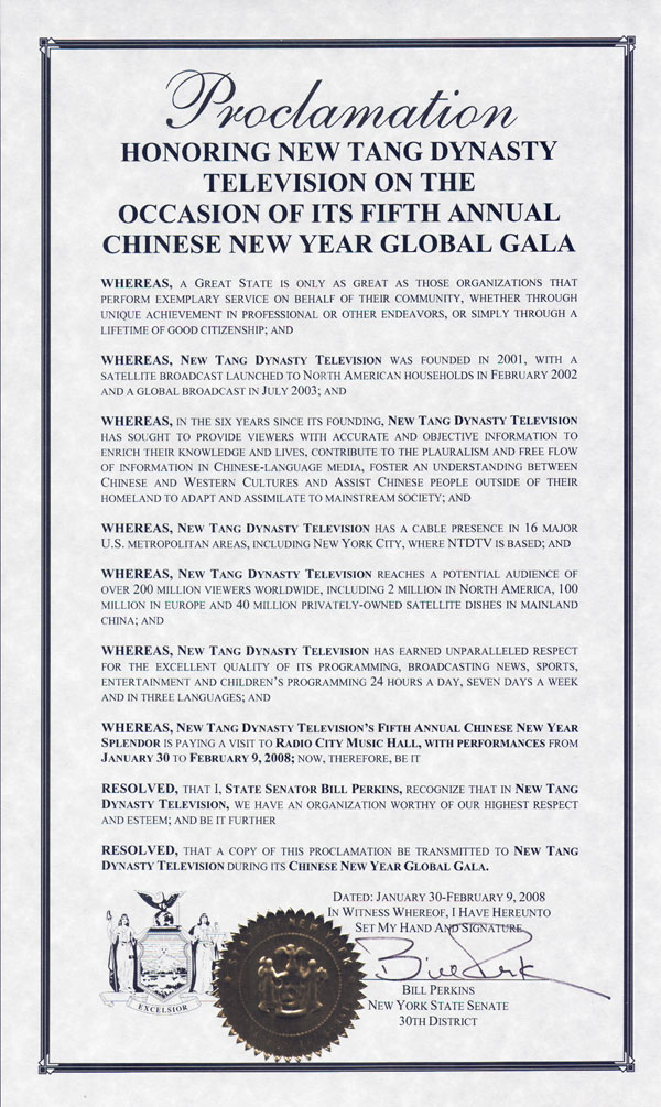 鉴此,我,纽约州参议员比尔•博金斯(Bill Perkins),嘉奖新唐人电视台,新唐人电视台值得我们给予最高的敬意。