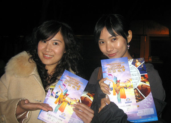 年轻的慈芸和禕珊直呼非常幸运,能观赏神韵晚会的台湾首演,她们说以前常看芭蕾舞表演,第一次看到这样具有特色、演绎中国传统文化的演出,真是太精彩了。禕珊对于神韵晚会将后羿射日、嫦娥奔月和岳飞《精忠报国》等大家耳熟能详的神话及历史故事以如此生动的方式呈现,觉的印象非常深刻。慈芸也说平日很少有机会能看到这样的具有纯正中国文化传统的演出,透过这台晚会自己好象上了珍贵的一课。