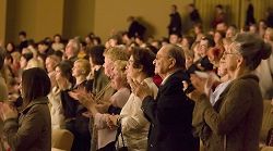 神韵巡回艺术团于三月十一日下午在布拉格国际会议中心大厅进行第二场演出,演出结束时,观众长时间鼓掌,大幕因此两度拉开,演员两次向热情的观众谢幕,大幕再次合上时,大部份观众都仍旧站在原地热烈的鼓掌,望着舞台依依不舍,一点都没有离开的意思,当大幕第三次拉开,身着绚丽多姿演出服的演员们再次出现在观众面前时,观众席上传出了欢呼声和更热烈的掌声。