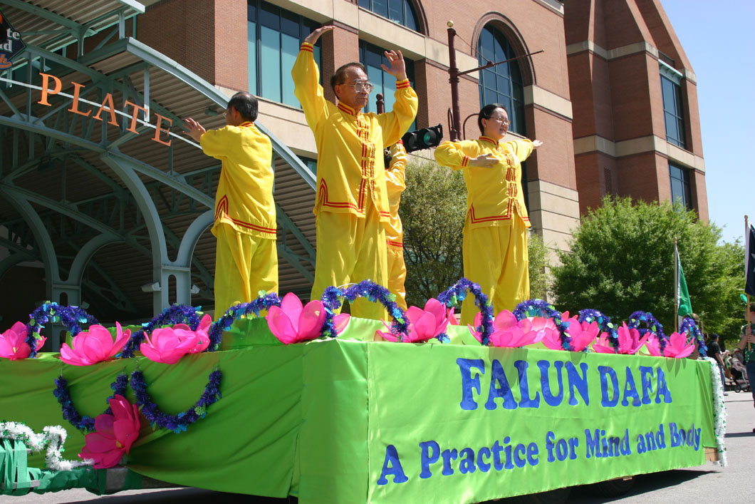 游行于中午十二点于德州路(Texas Ave)正式开始,欢庆的一百二十个游行团队经由三条街口,回到原处。法轮功队伍的方阵,首先是由穿着黄色炼功服的法轮功学员举着“Falun Dafa (法轮大法) ”横幅,其后是仙女队,动作优雅,随之而来的是炼功花车,穿着炼功服的学员向沿路观众展示法轮功五套缓慢、优美的功法,将大法福音传递于民众,深受人们欢迎。